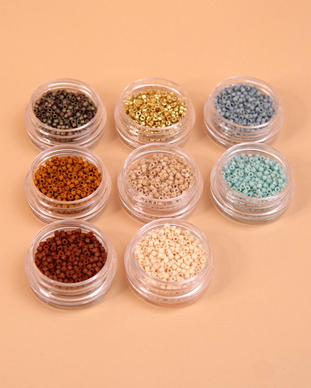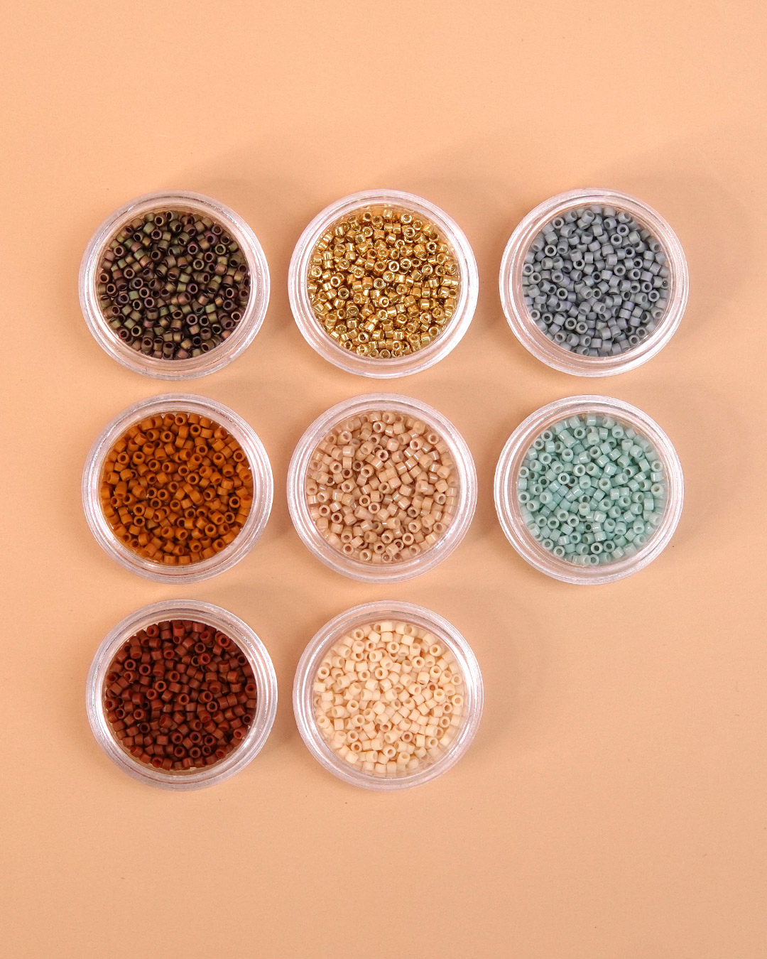 - 8 couleurs de perles Miyuki Delica 11/0. Quantité : 2 gr par couleur, soit environ 350 perles de chaque couleur.