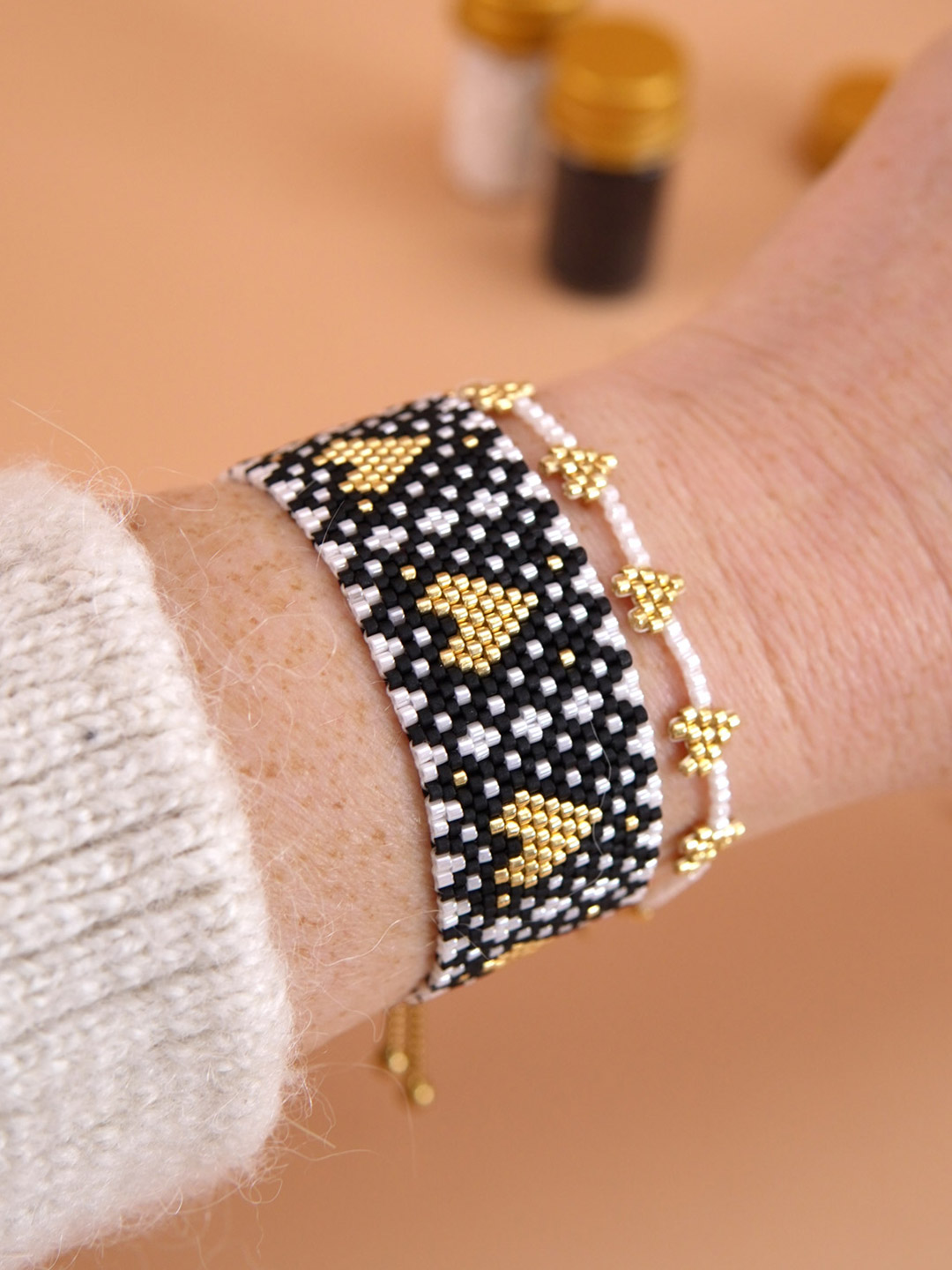 Avec cet assortiment, vous pouvez reproduire le bracelet “Coeurs enneigés” de mon ebook “Créer des bracelets en perles sur-mesure” ou utiliser les couleurs pour d’autres modèles de bijoux en perles Miyuki. Il s’agit bien d’un assortiment de perles. Ce produit ne contient pas le reste du matériel pour reproduire le bracelet (fil, fermoir ect…). Le fermoir utilisé pour ce modèle est composé d’embouts pour tissage de perles 16 mm et d’une chaîne coulissante.
