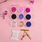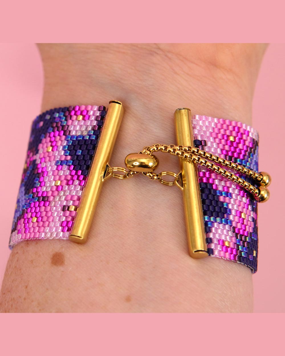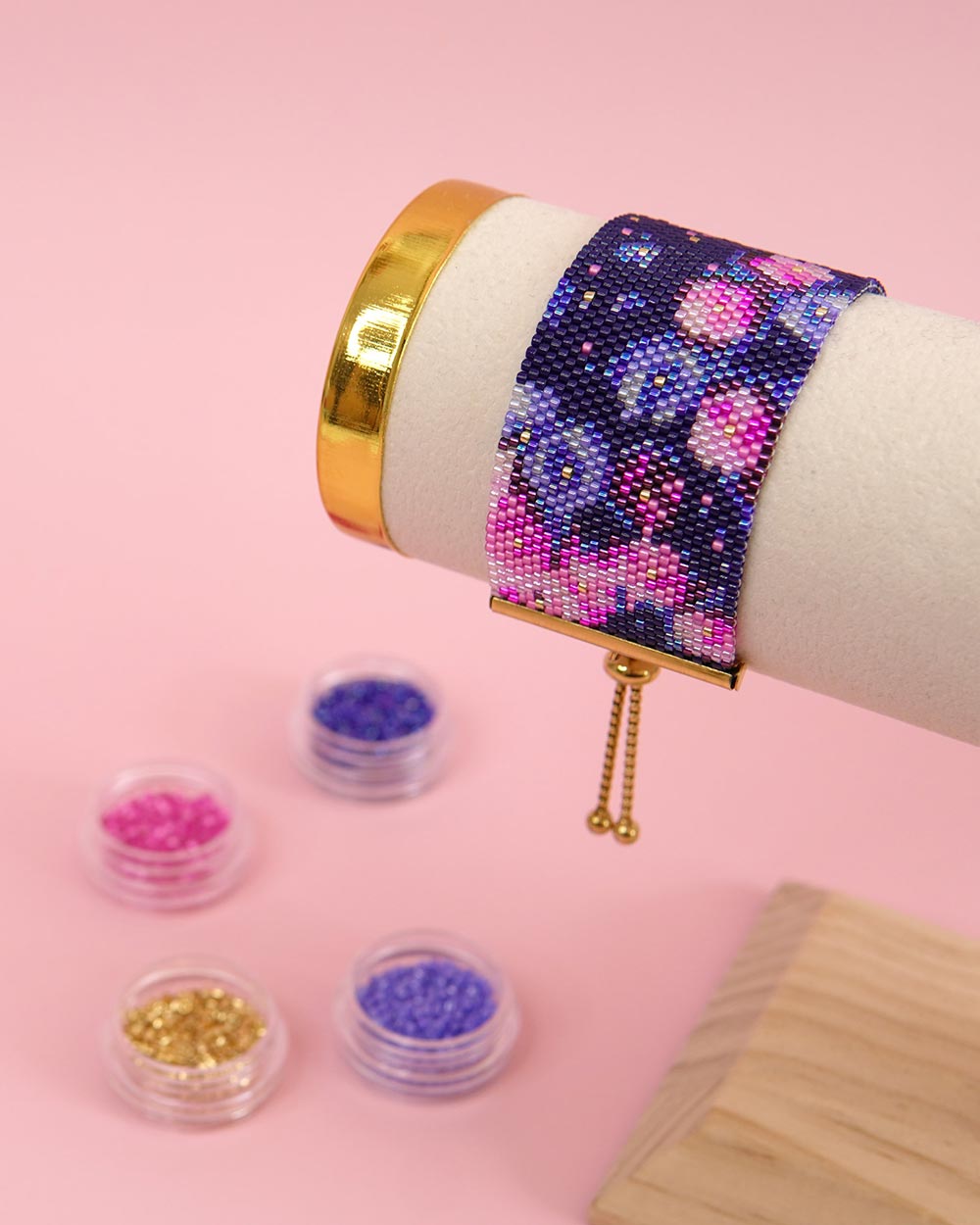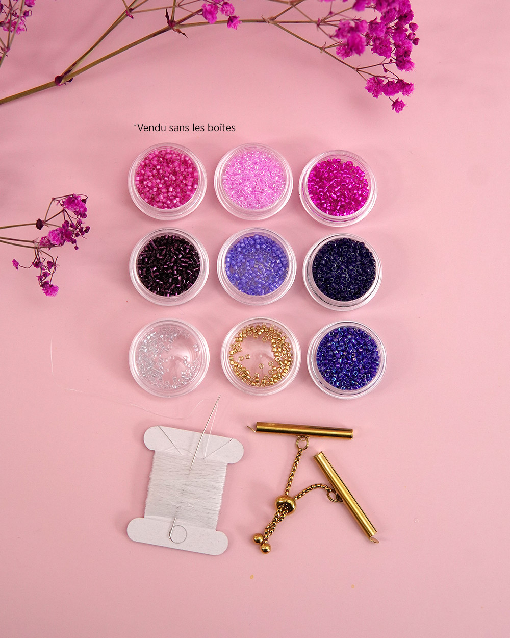 Voici un pack spécial qui réunit tout le matériel nécessaire : les perles, le fermoir (embouts et fermoir déjà pré-assemblés), une paire de clous d’oreilles en acier inox doré, une aiguille et du fil de tissage.