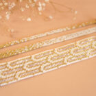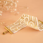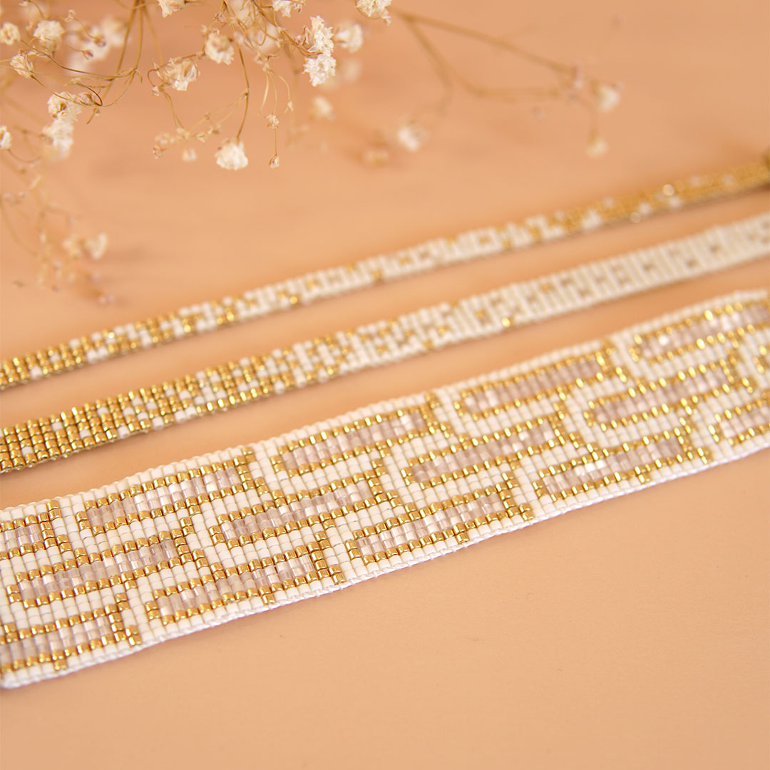 Bracelet en perles Miyuki pour mariage ou cérémonie tissé à la main en Occitanie (France). Ces bracelets sont tissés sur métier à tisser avec des perles de rocailles cylindriques d’une grande finesse et régularité. Le tissage du grand modèle style Art Déco demande près de 4h de tissage. Les perles utilisées ont une très bonne tenue dans le temps et le fermoir est en acier inoxydable doré.