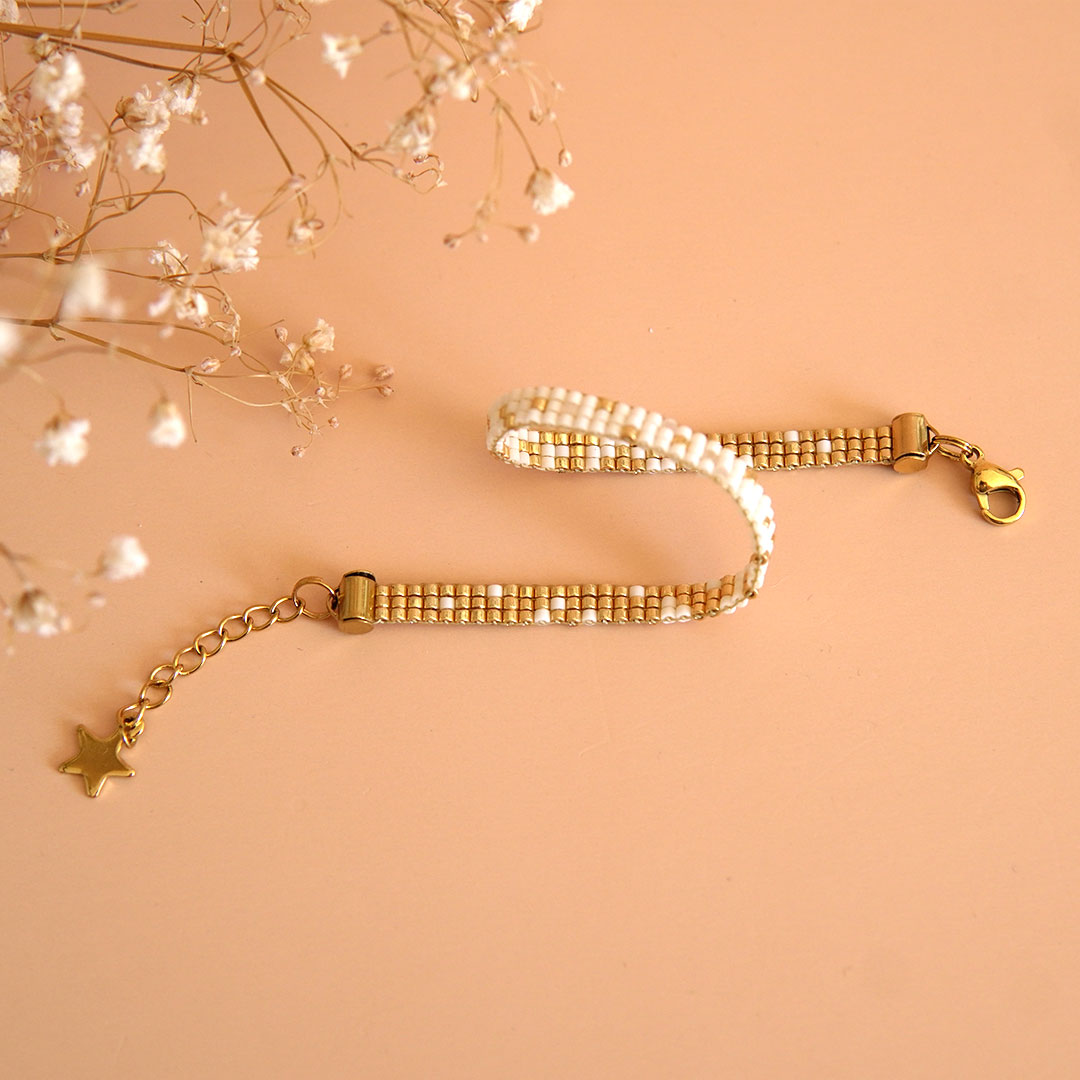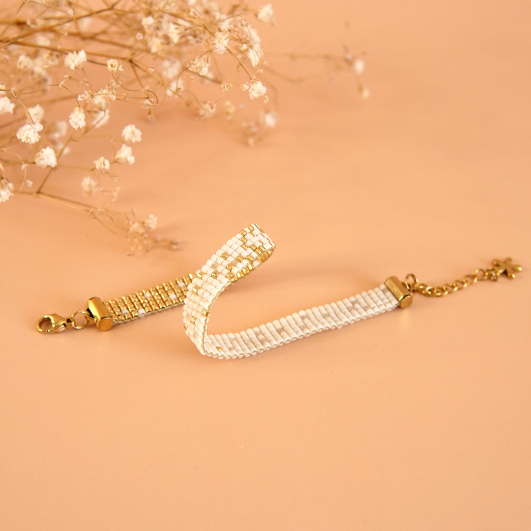 Certaines perles appelées perles “silk” sont ajoutées au tissage afin de donner encore plus de reflets et de profondeur à la création. Avec les changements de lumières, elles sont tantôt plus sombres, tantôt très brillantes ce qui donne un effet très chic aux bracelets. Ces bracelets en perles Miyuki s’accorderont aussi bien à une robe de mariée qu’à une tenue de cérémonie. Le doré et le blanc crème sont des teintes qui se marrient avec un grand nombre de tenues mais si ces couleurs ne conviennent pas, n’hésitez pas à me contacter pour demander une personnalisation des modèles.