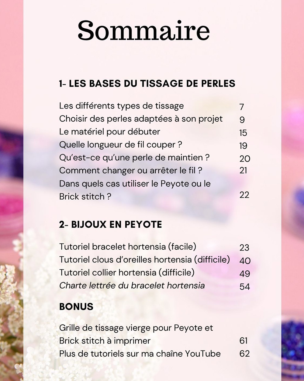 - un deuxième chapitre pour réaliser une parure inspirée des hortensias contenant : 1 tuto bracelet en peyote pair, 1 tuto pour apprendre à faire des petites fleurs en perles inspirées des hortensias qui pourront être enfilées sur des clous d’oreilles et 1 tuto pour apprendre à relier ces fleurs à une chaîne afin de créer un collier. Ces tutos sont accompagnés de 3 vidéos* + pas à pas écrit avec schémas des étapes.