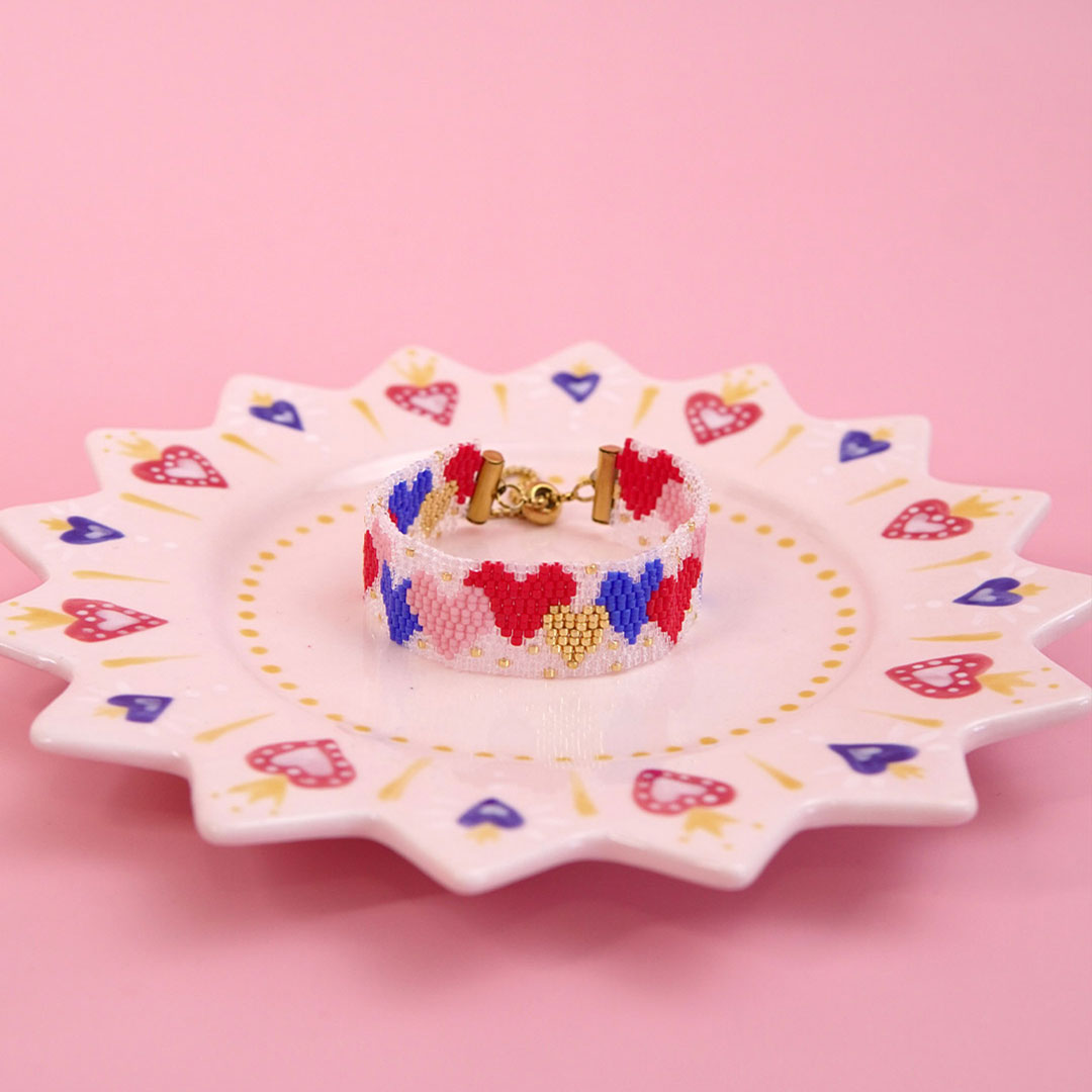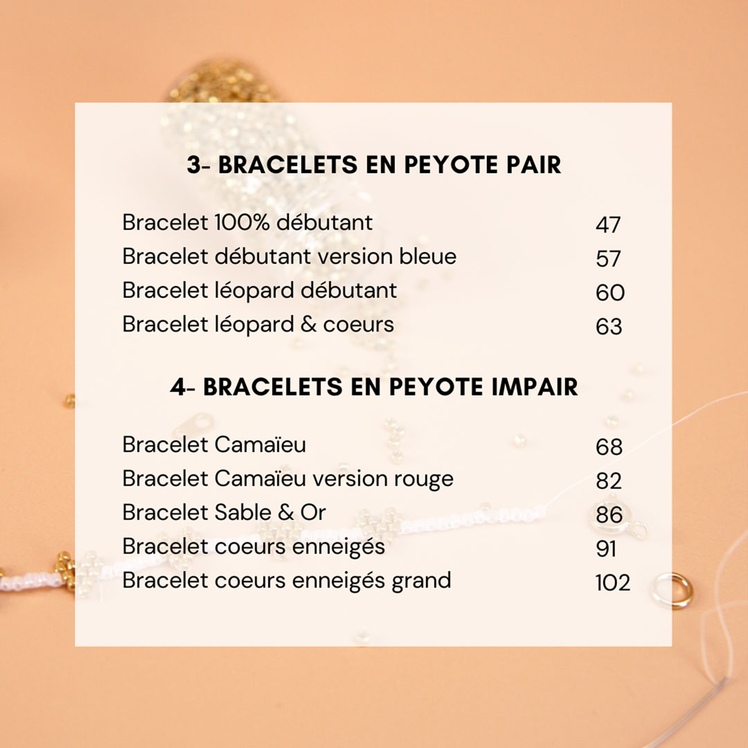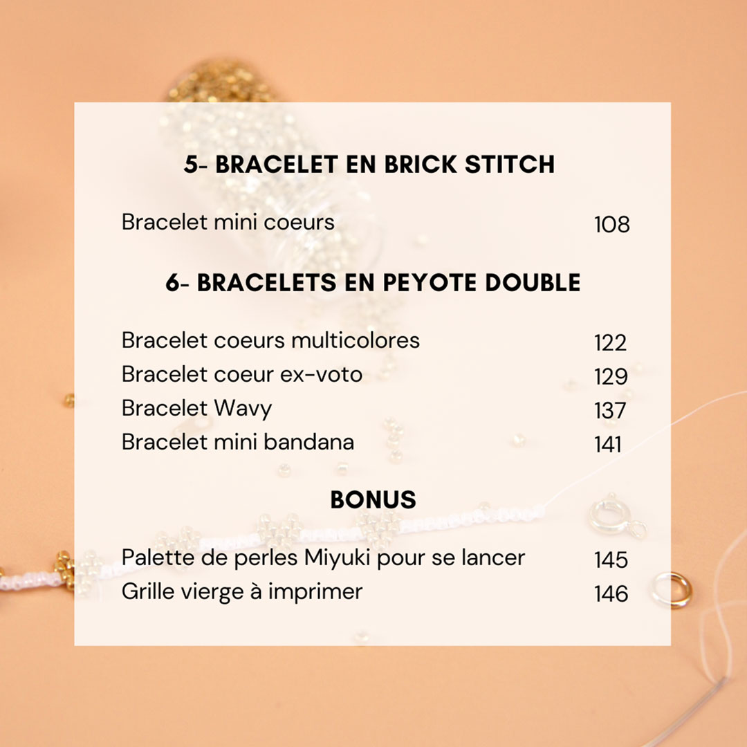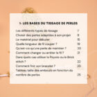 Puis, place à la pratique avec des bracelets classés par techniques : vous avez une partie dédiée au peyote pair, dont un bracelet 100% débutant en version rouge et en version bleue, un léopard débutant et un léopard & cœurs un peu plus large, une partie peyote impair avec le schéma du bracelet camaïeu et sa version rouge, un bracelet couleur sable & or, le modèle cœurs enneigés et une version plus large, une partie brick stitch avec un bracelet mini cœurs, et enfin une partie peyote double dont le bracelet cœurs multicolores, cœur ex-voto, wavy et mini bandana. Bref : de quoi progresser et vous amuser ! ✨