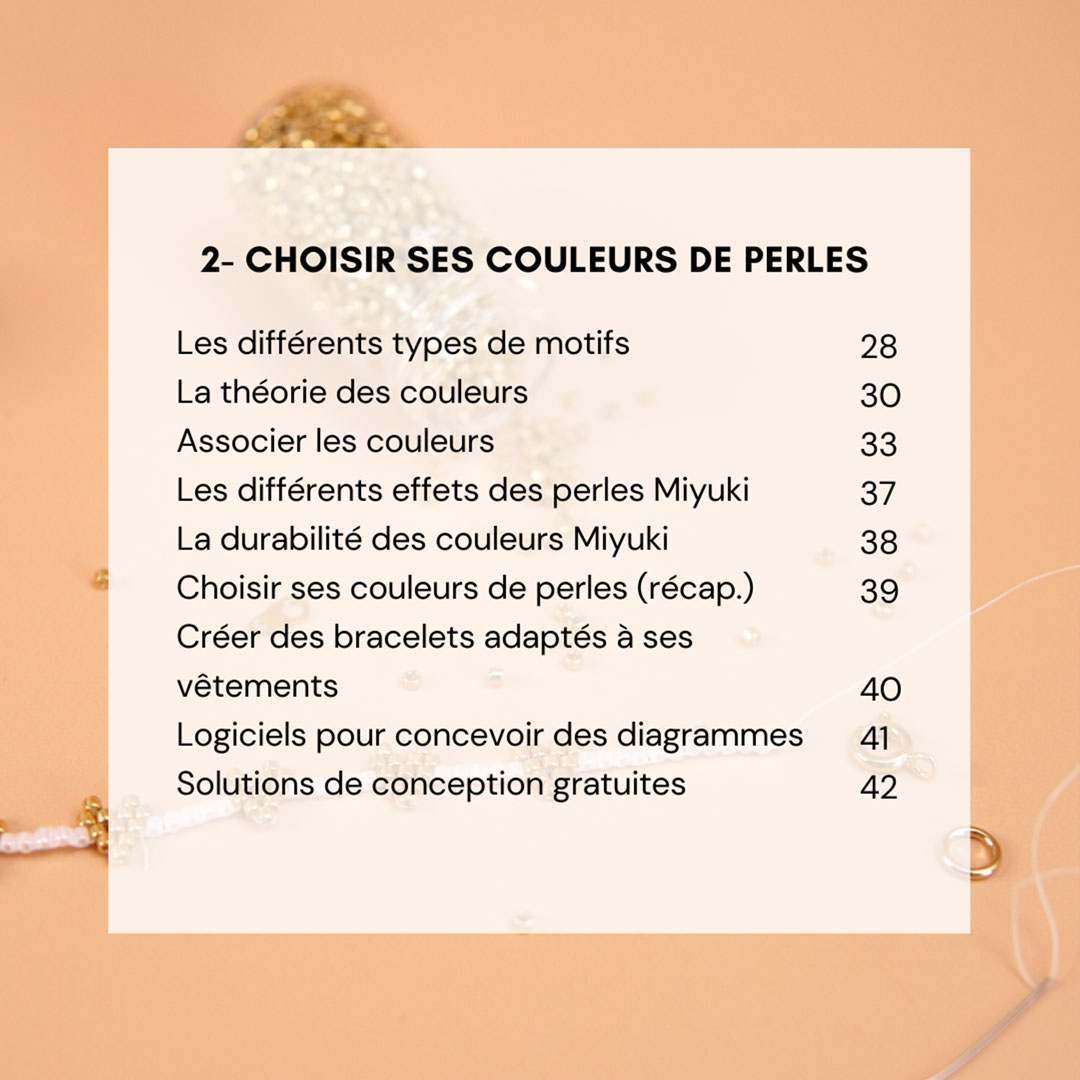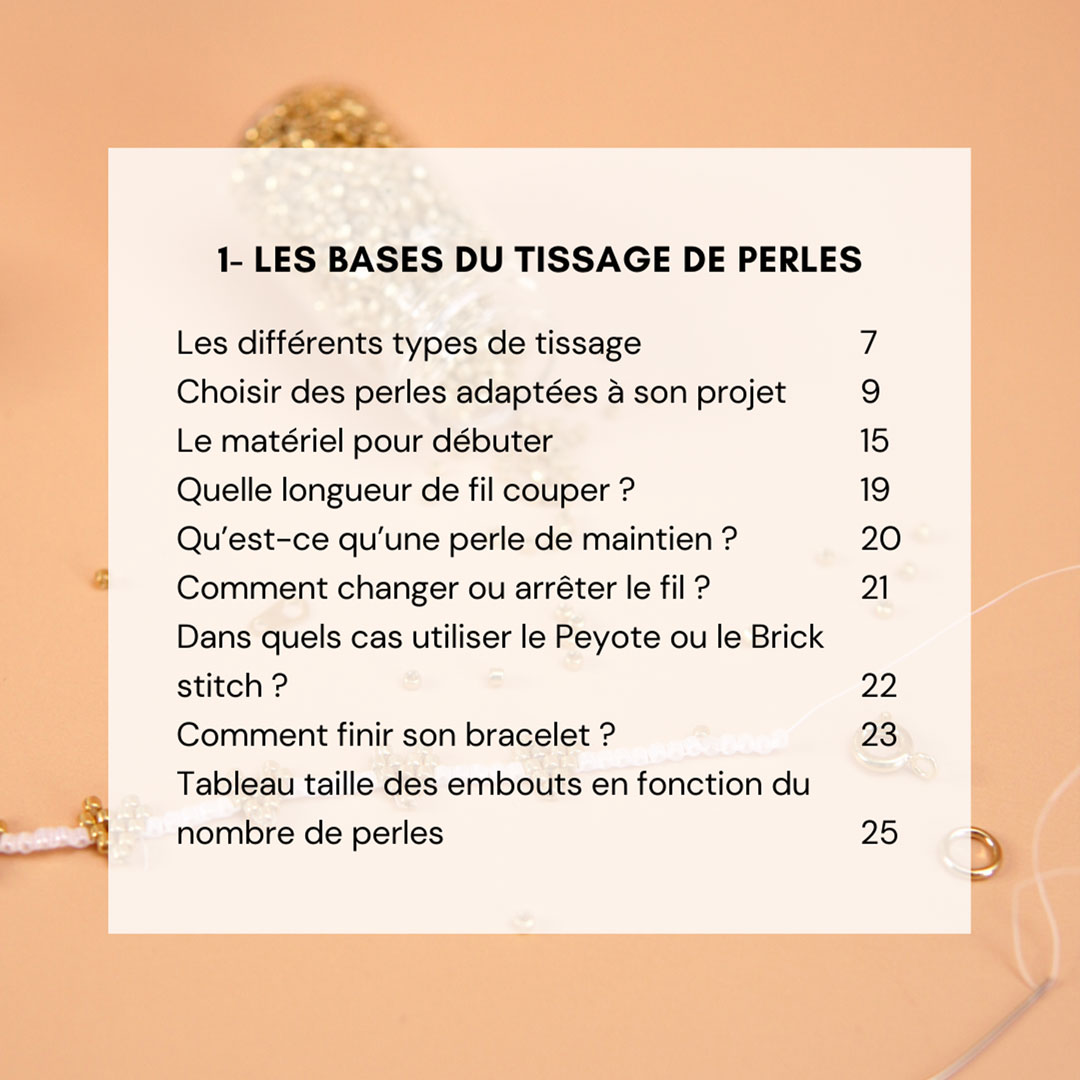 Dans cet ebook, vous retrouverez plusieurs chapitres pour aborder le tissage de perles à l’aiguille et surtout apprendre à adapter vos créations à vos goûts, vos couleurs et vos tenues 💛