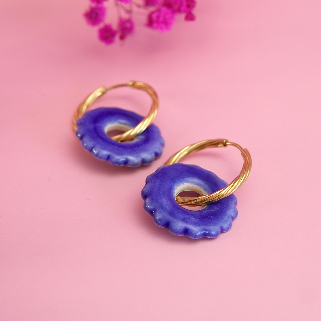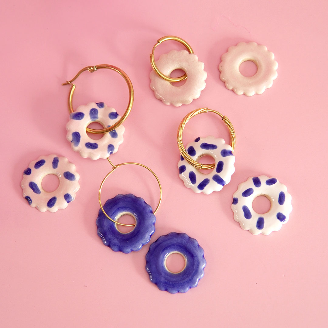 Ces pampilles donuts en céramique sont des pièces uniques et artisanales fabriquées en France. Elles sont peintes à la main avec des émaux, elles ne sont donc pas parfaitement identiques. Ces breloques donuts à enfiler sur des créoles sont plus originales que des breloques en plastique et produites industriellement.